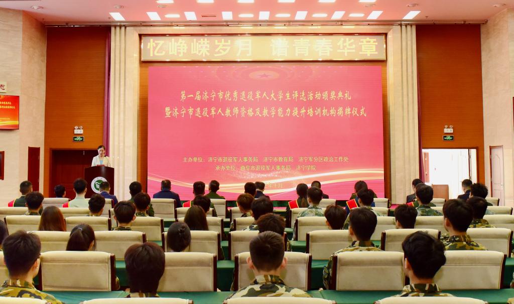 刘国栋同志和张繁翔同志共同为“济宁市退役军人教师资格及教学能力提升培训机构”进行揭牌并为优秀退役军人大学生颁奖。
