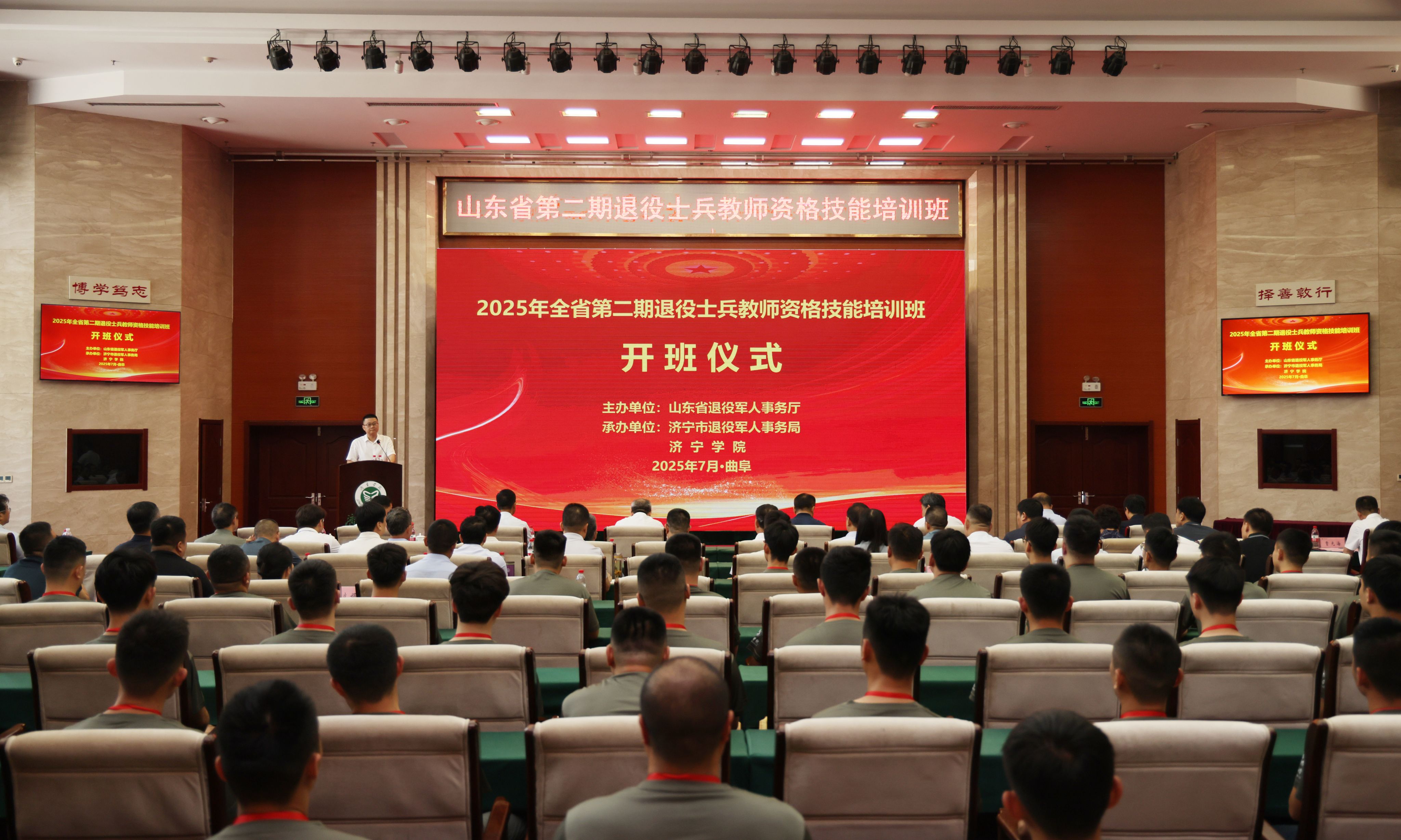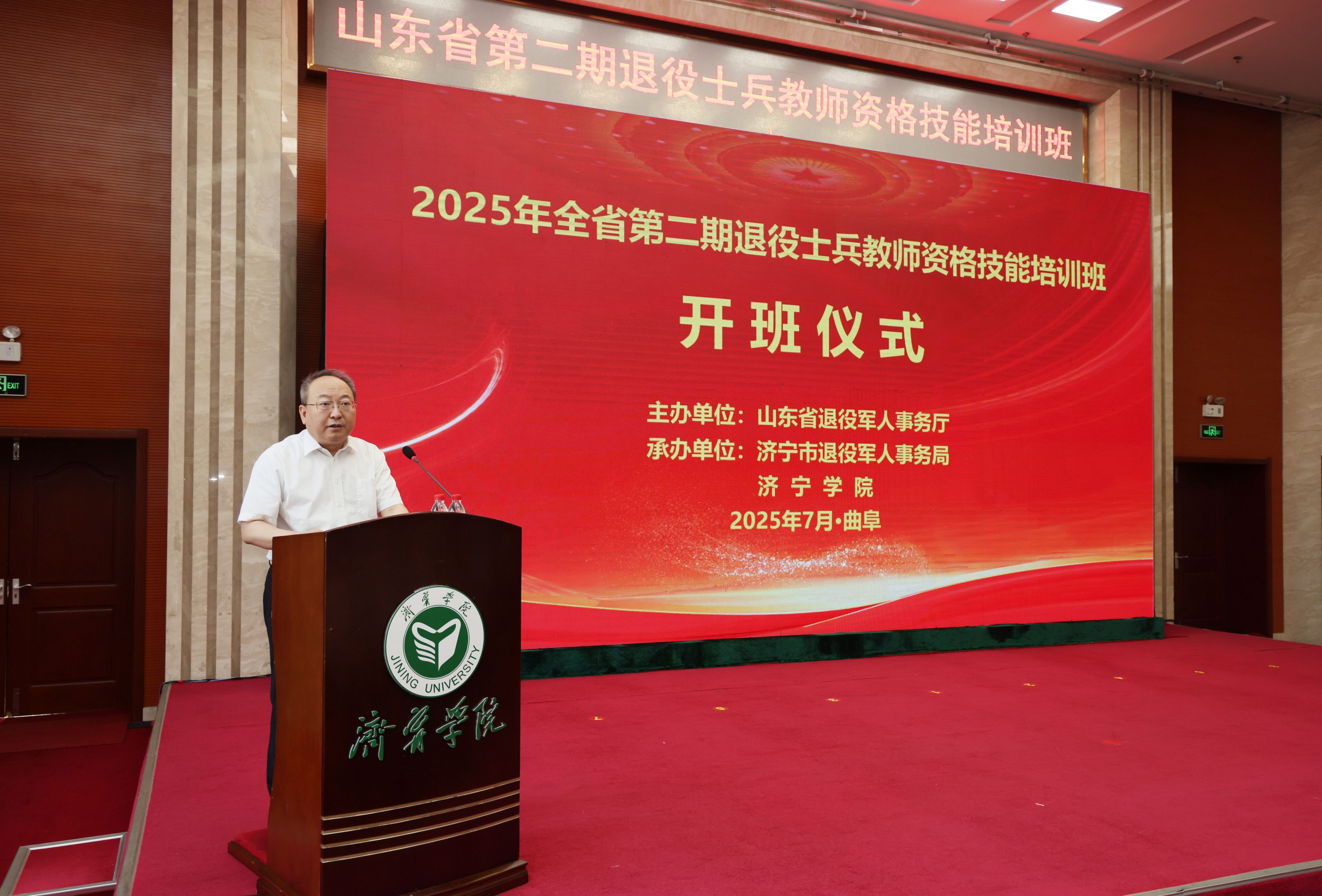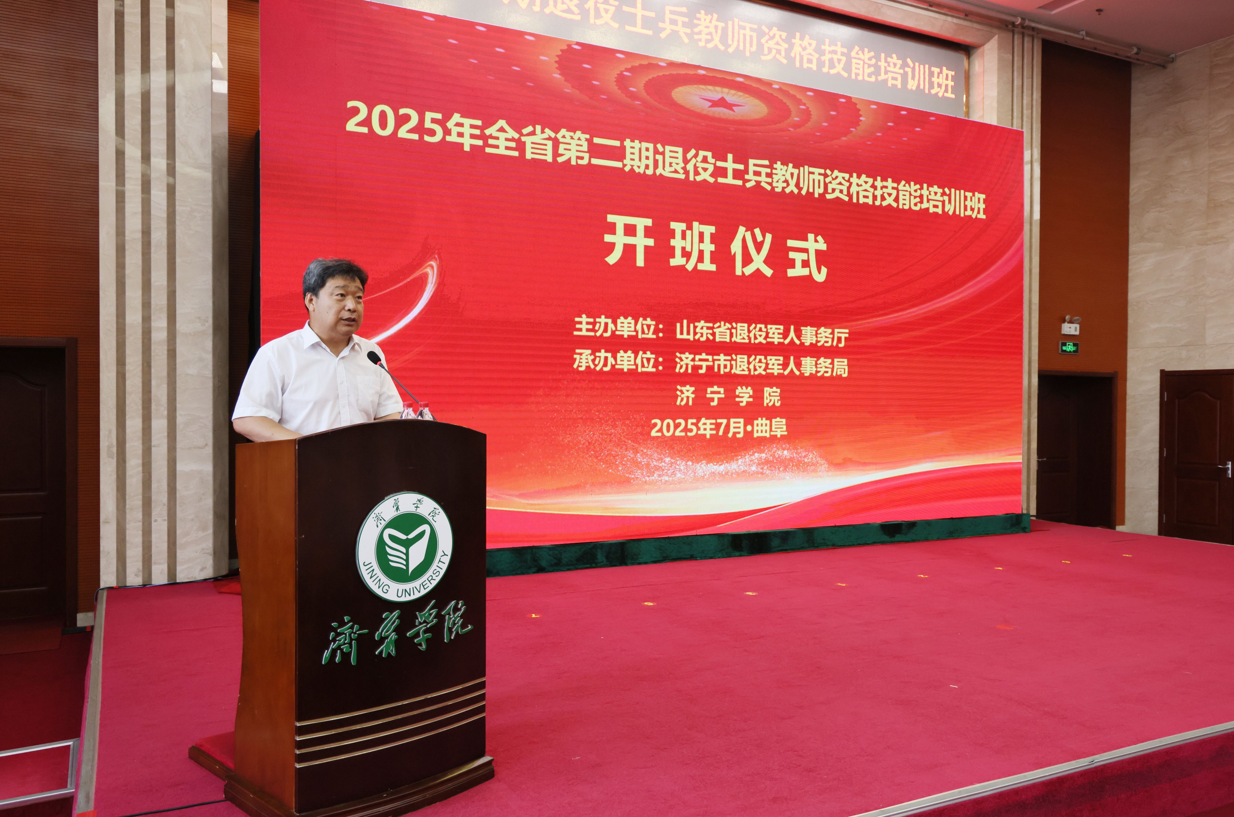 7月14上午,由山东省退役军人事务厅主办,济宁市退役军人事务局、bv1946伟德承办的山东省第二期退役士兵教师资格技能培训班在我校开班。山东省退役军人事务厅党组成员、副厅长高志国,bv1946伟德党委副书记、校长王清明,山东省退役军人事务厅就业创业处处长王秀正,济宁市副市长、市公安局局长张大勇,济宁市政府副秘书长常寰斌,济宁市退役军人事务局党组书记、局长王秋霞出席开班仪式。仪式由bv1946伟德副校长刘国栋主持。