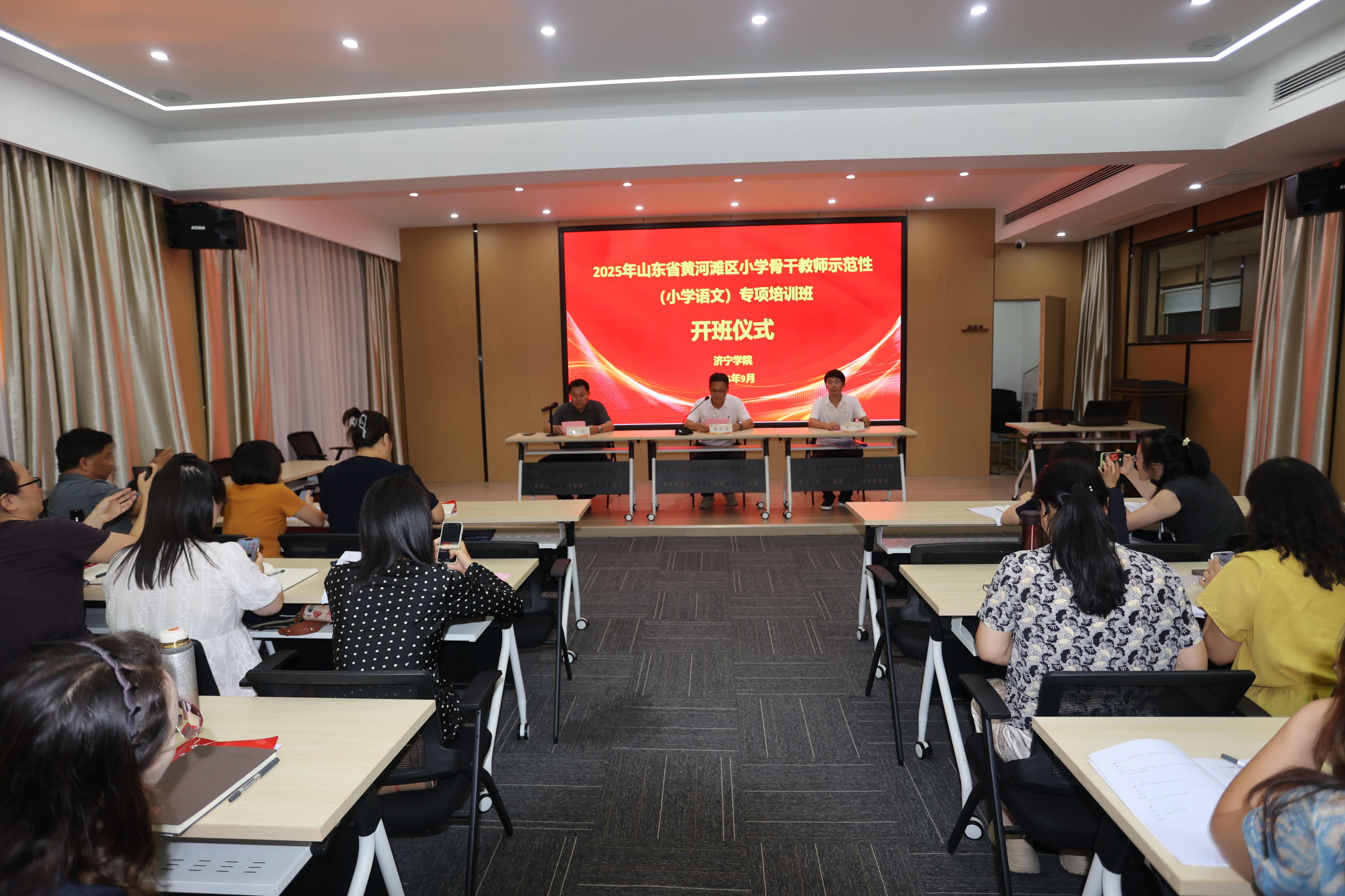 9月14日,2025年山东省黄河滩区小学骨干教师示范性培训(小学语文)专项培训在我校顺利开班。伟德国际victor·1946源自院长曹光海、副院长耿亮、培训科张利及来自全省的50名小学语文骨干教师参加活动。开班仪式由耿亮主持。